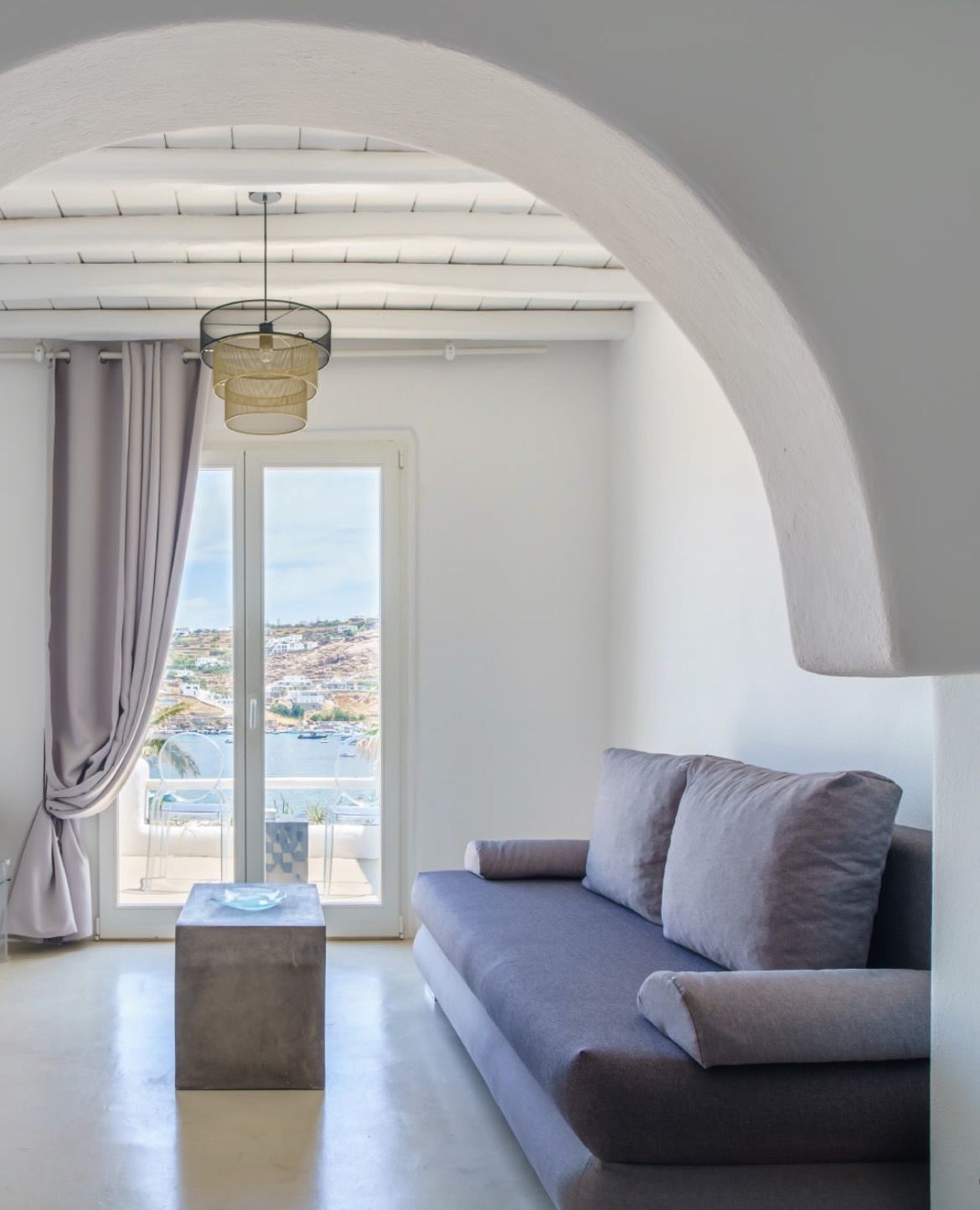 As you approach the hotel, you can't help but be in awe of its magnificent design and prime location. The hotel gracefully stands before you flaunting its beauty and serenity. It's not just a hotel; it's a refuge to relax, yet, still be at arm's reach of Mykonos' lusty attractions.
