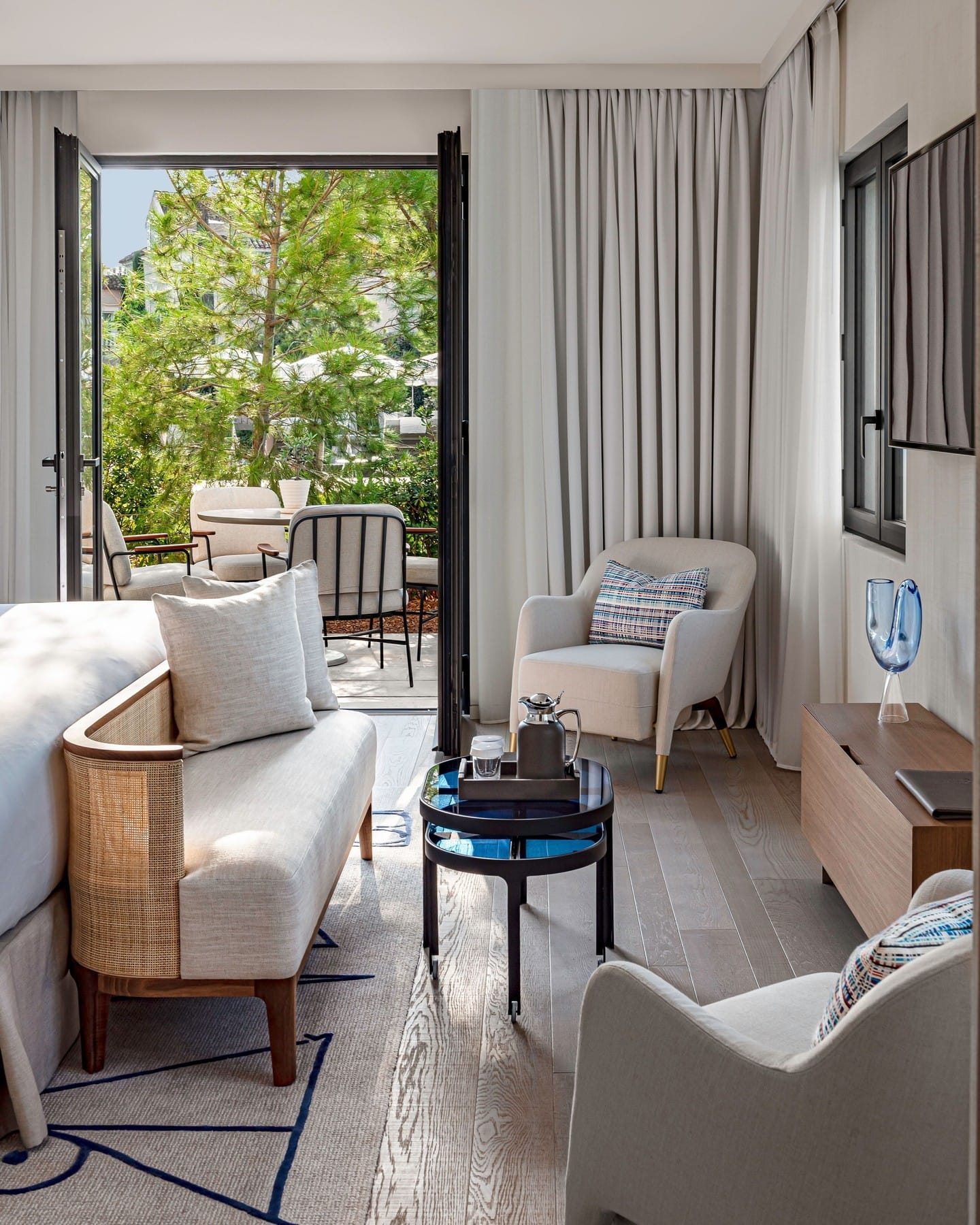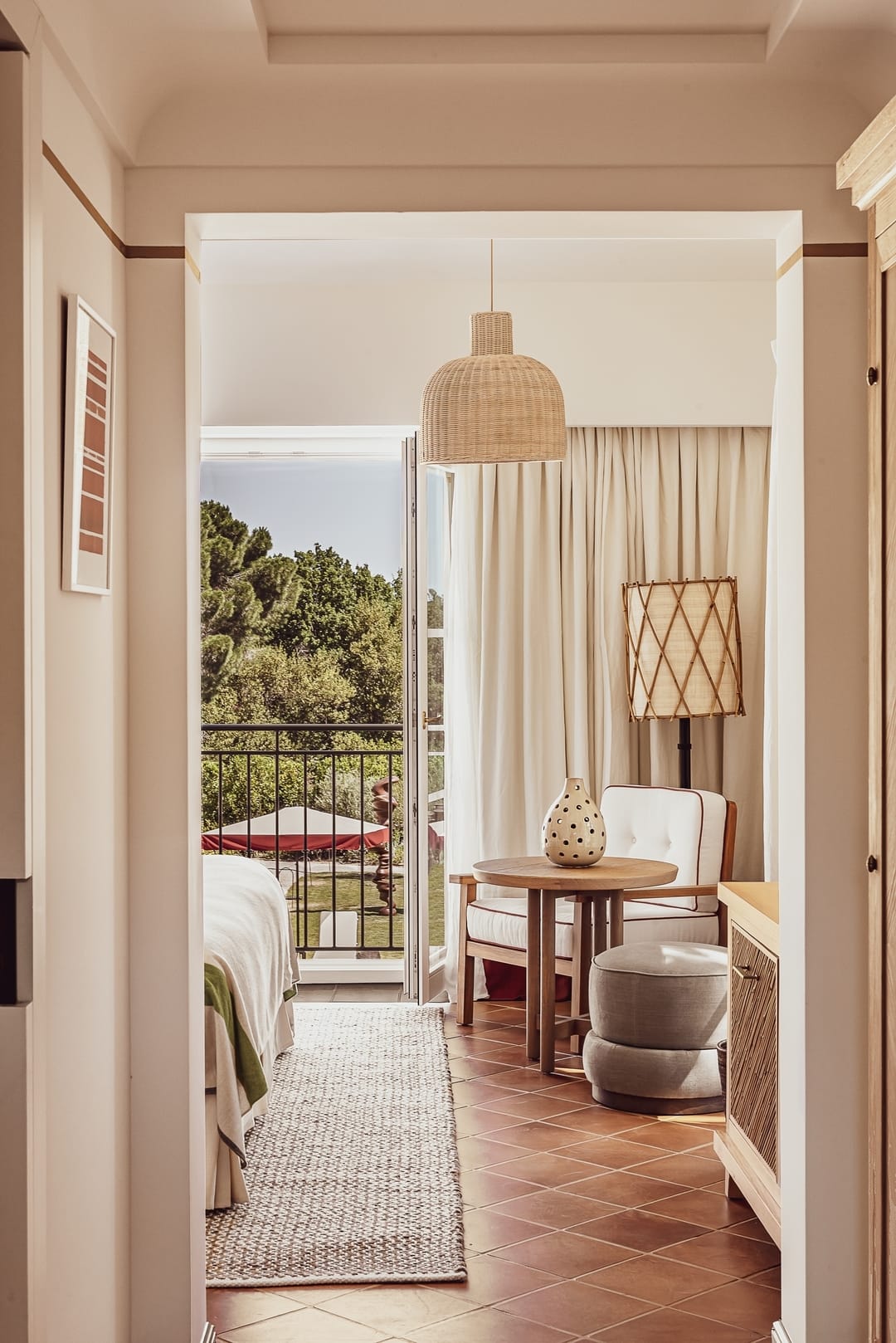From the moment you arrive, you’re surrounded by lush, beautifully landscaped gardens that set a serene tone. Designed by French architect Charles Zana, the hotel combines vintage chic with contemporary sophistication. Earthy tones, natural materials, and a sense of effortless luxury are found throughout the property.