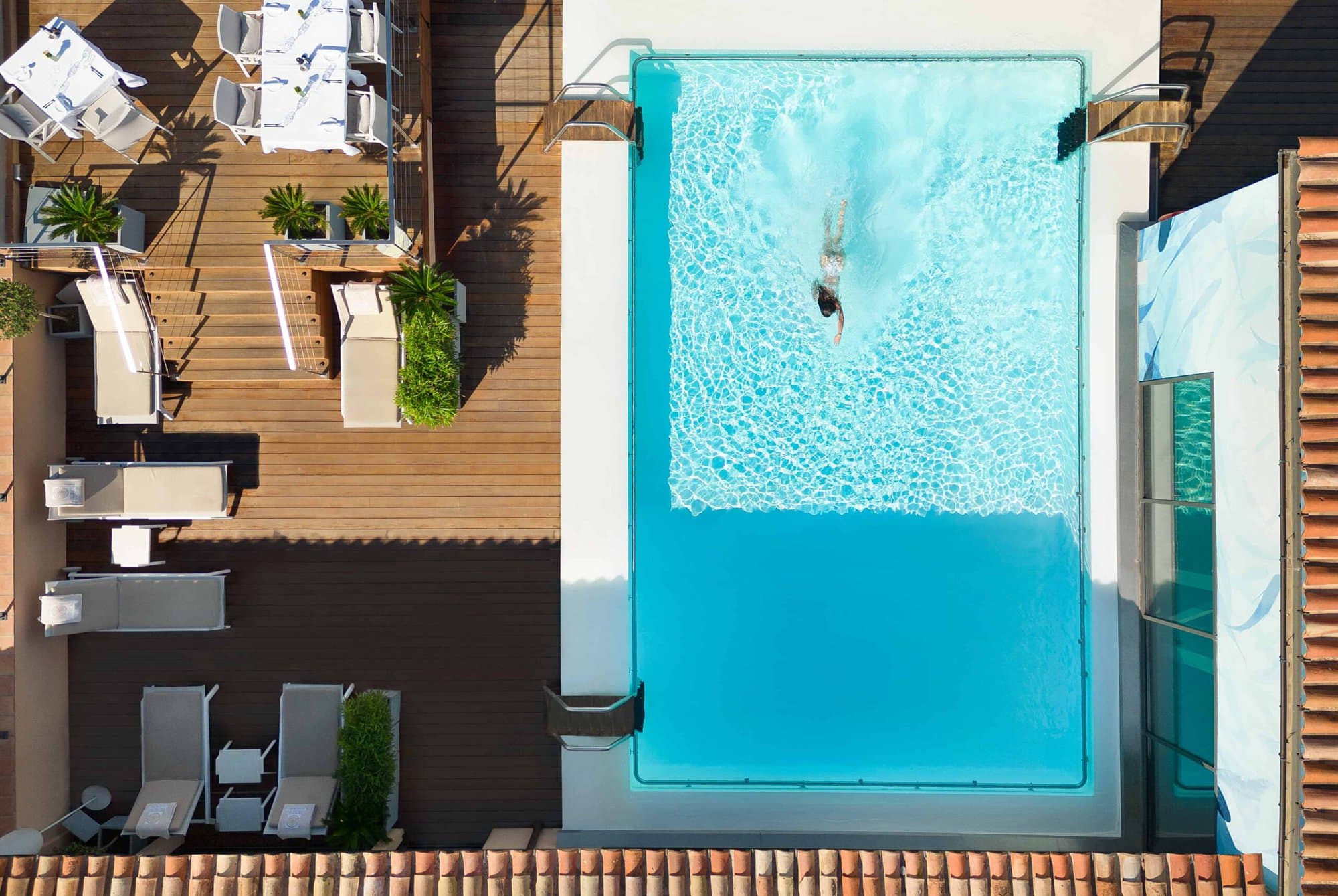 Service is impeccable, with a friendly and efficient staff led by manager Danielle Lagrange. Amenities include St. Tropez’s only rooftop pool with views over the village and port, a Clarins spa with hammam, sauna, sensory shower, and ice fountain, and a glass-ceilinged gym with Evian on tap. A hotel shuttle is available to transport guests to nearby beach clubs in Ramatuelle. Children and dogs are warmly welcomed with special amenities.