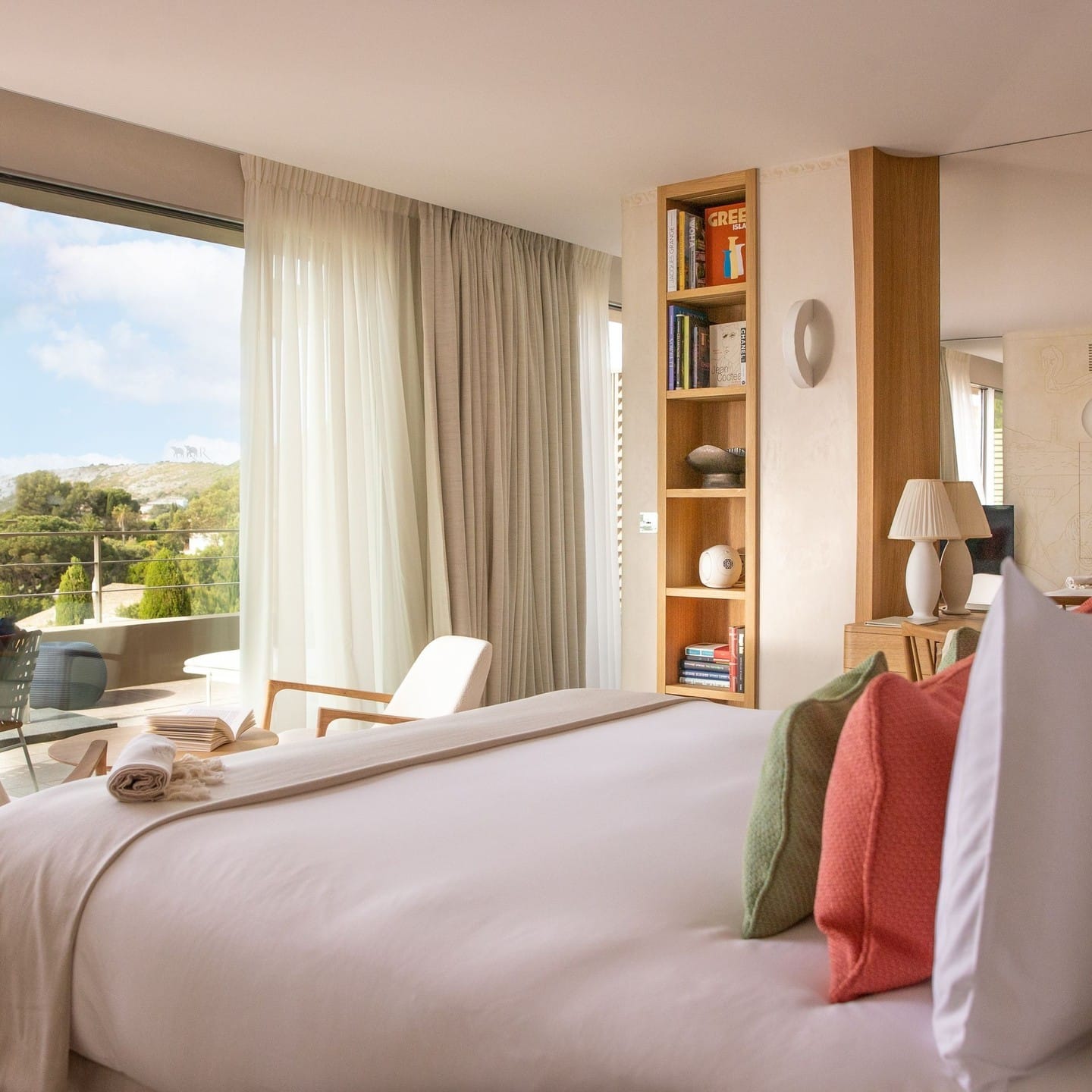 The 34 rooms and suites are spacious, bright, and thoughtfully decorated with bespoke furnishings and handcrafted details. Private terraces offer views of the gardens or the inviting pool, creating a perfect spot to unwind. The plush beds and luxurious linens make for a restful night's sleep.
